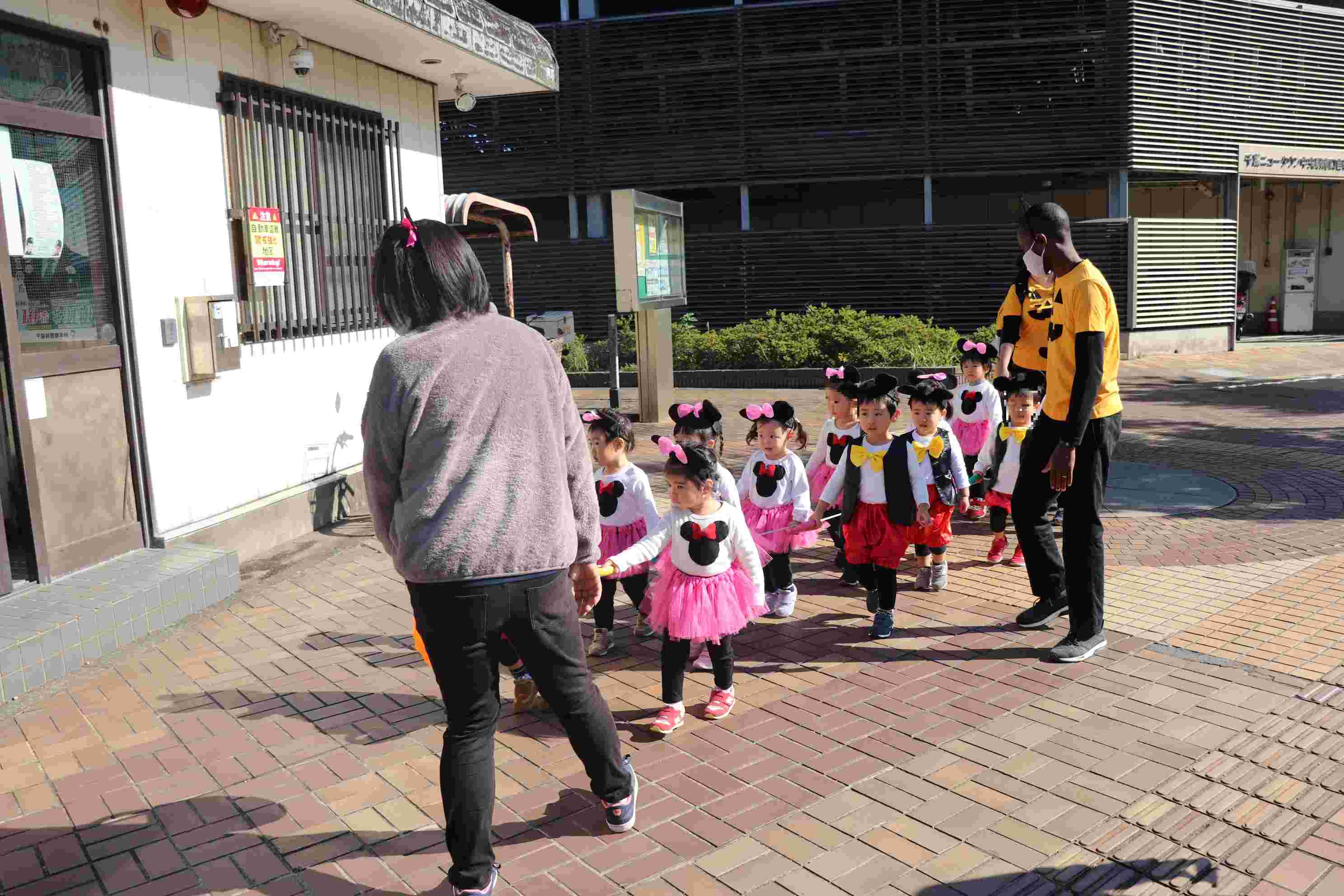 駅前分園は電車通勤をする保護者に嬉しい立地。保育室はビルの2階ですが、屋上園庭を備え、短い時間でも外遊びができます。また天気が良い日はお散歩カーや歩きで近隣の公園へ。広い歩道で安全が確保され、街の雰囲気や人の流れ、そして子どもたちに大人気の電車を見ることができる楽しさと刺激があります。毎年恒例のハロウィーンパレードは駅前分園だけのイベントとなっています。
